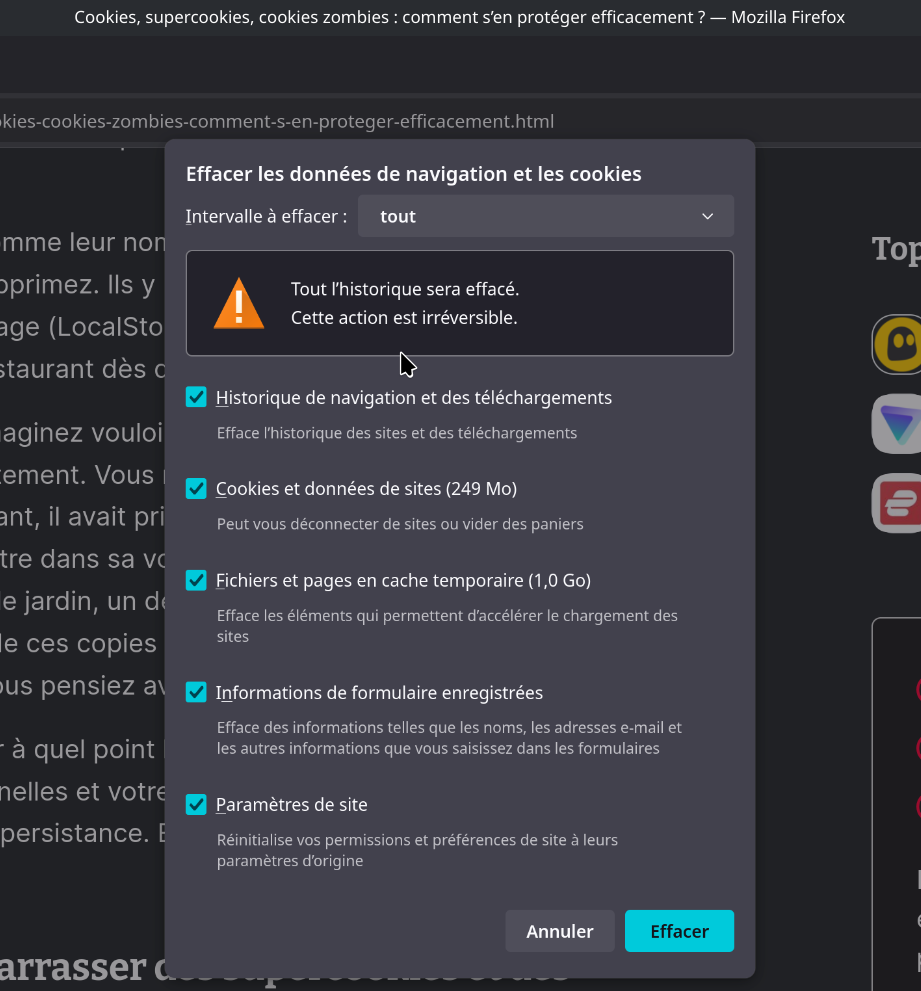 Reste enfin le cas des cookies zombies, ou evercookies. La seule façon d’en venir à bout consiste à effacer toutes les données de site du domaine concerné et à empêcher leur réinstallation. Les protections intégrées aux navigateurs modernes, qui compartimentent de mieux en mieux les stockages tiers, permettent de limiter leur efficacité, tout comme les bloqueurs de traqueurs qui coupent court aux scripts chargés de les réinjecter.