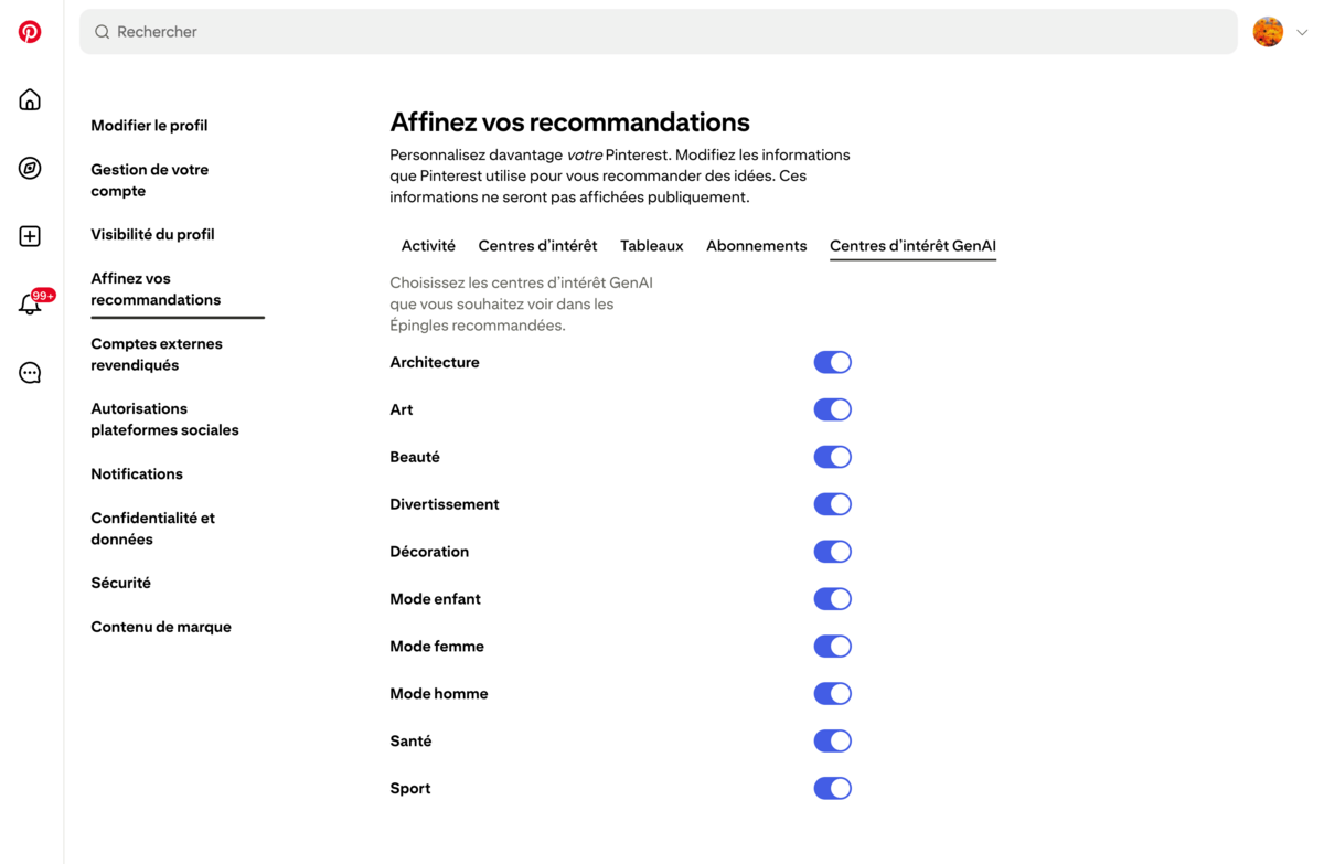 - Des épingles suggérées en fonction du profil de l'utilisateur.