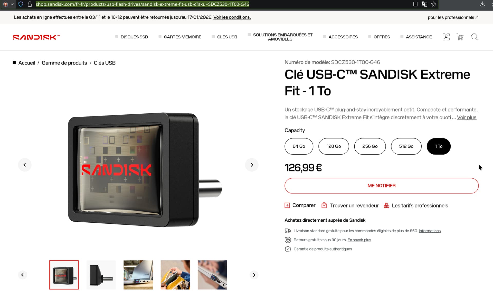 Plus important, il faut noter que la clé n'est disponible qu'avec un seul type de connecteur, de l'USB-C, et que le lancement a été réalisé avant même la publication de ce communiqué : Sandisk parle d'une sortie le 4 novembre dernier sur sa boutique en ligne, shop.sandisk.com, ainsi que chez « certains revendeurs dans le monde ». Il est aussi intéressant de noter que malgré ses spécifications plutôt haut de gamme, la clé ne semble pas inaccessible.