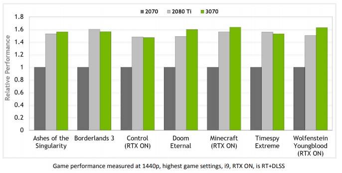 Vous l'aurez constaté, la GeForce RTX 3070 excelle en 1440p et NVIDIA signe une carte équilibrée avec une consommation électrique maitrisée. Si on fait la moyenne des performances de tous nos jeux testés en 1440p, cette carte est 55% plus rapide que la RTX 2070 et 2% plus véloce que la RTX 2080 Ti.