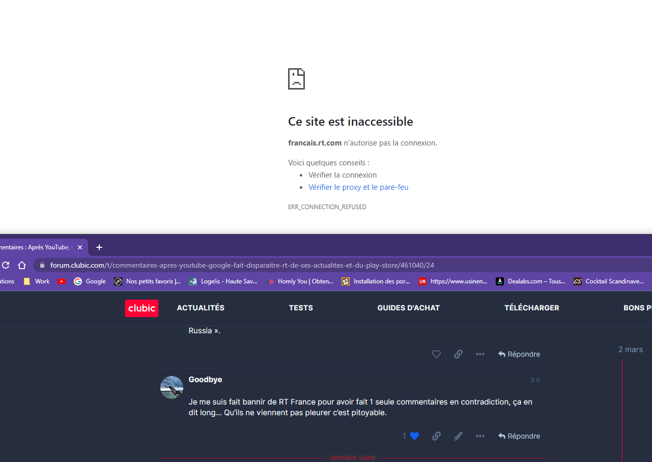 Je me suis fait bannir de RT France pour avoir fait 1 seule commentaires en contradiction, ça en dit long… Qu’ils ne viennent pas pleurer c’est pitoyable.