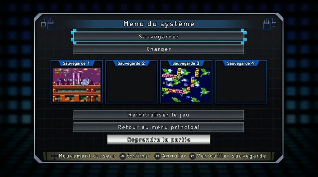 Dans ce second cas, la Mega Drive Mini permet de choisir parmi trois arrière-plans : un fond noir et deux dessins pas très réussis. Compte tenu de ce que cela coûte, il est dommage que Sega ou M2 n'aient pas décidé d'en proposer davantage ou de permettre aux utilisateurs d'uploader les leurs au travers de l'interface USB. De manière générale, on regrette le manque d'options et le manque de souplesse de l'interface. Il en va de même pour les options « avancées » lorsque l'émulation est en cours. En effet, il est possible - comme sur les NES et SNES Classic Mini - de sauvegarder sa position. Quatre emplacements sont même disponibles pour chaque jeu. Hélas, il faut pour cela passer par un écran longuet à venir.
