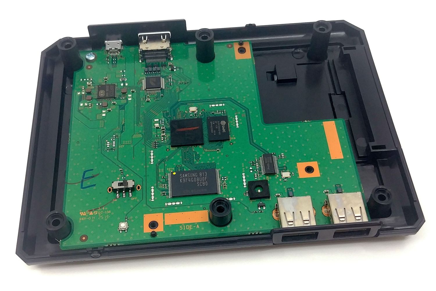 Un pad thermique - que l'on retire aisément - vient assurer le contact avec la plaque thermique. Dessous, c'est un système sur puce (SoC) de marque Allwinner rebrandé en un Zuiki Z7213. Il s'agit du type de processeur que l'on retrouve sur de multiples systèmes et une version similaire prenait par exemple place dans certaines consoles AtGames. Côté puissance, aucune inquiétude à avoir, il est largement assez costaud pour faire tourner les titres Mega Drive. Il est par ailleurs accompagné par 512 Mo de mémoire flash, une puce signée Samsung sur la version européenne. On remarque aussi la présence d'un composant AXP223 en charge de la gestion de l'alimentation, mais pas grand-chose à dire de plus sur cette carte-mère pour le moins dépouillée.