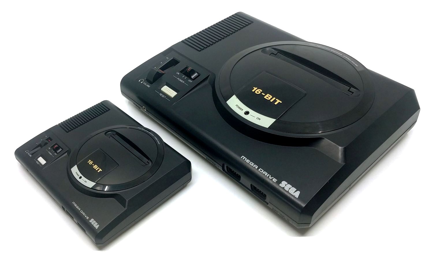 Dès lors que l'on déballe véritablement la console et ses accessoires, c'est évidemment le côté « réplique exacte » qui fait plaisir à voir. Tous les amateurs de la Mega Drive seront ravis du soin apporté par Sega, au moins côté design. La console ressemble donc comme deux gouttes à son illustre ancêtre, pour le coup dans sa version européenne. Nous aurons l'occasion d'y revenir au moment de parler de la manette et du catalogue de jeux, mais les versions nord-américaine, japonaise et sud-coréenne sont légèrement différentes : elles reprennent logiquement le dessin de la Mega Drive sortie à l'époque dans ces territoires.Les joueurs européens remarqueront avec bonheur la présence du fameux logo « 16-BIT » sur le dessus de la console ainsi que le pourtour supérieur avec son « High definition graphics - Stereo sound ». Toujours dans l'idée d'offrir une réplique aussi parfaite que possible de la console originelle, Sega a placé les mêmes boutons / interrupteurs avec le poussoir de mise sous tension, le bouton de réinitialisation et le potentiomètre du volume. Un regret cependant, ce dernier n'est qu'un accessoire décoratif : il n'est pas fonctionnel. C'est finalement assez logique, puisque - autre regret - Sega ne propose pas de prise casque.