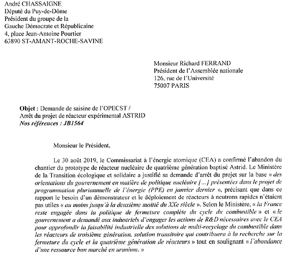 Lors d'une audition devant la Commission des affaires économiques du Sénat le 23 octobre dernier, l'administrateur général du CEA a expliqué le renoncement au réacteur nucléaire ASTRID, qui aurait permis le « recyclage à l'infini du combustible », comme relevant de raisons économiques.