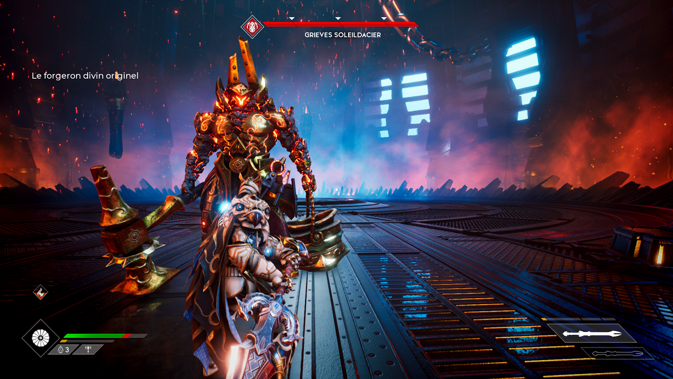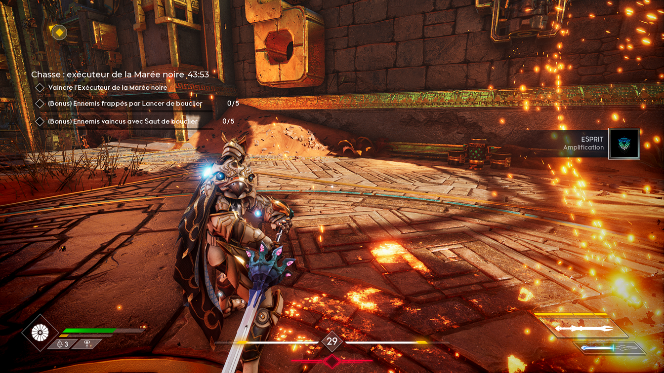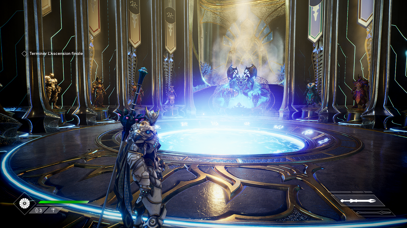 Les affrontements se déroulant le plus souvent en arènes et face à plusieurs adversaires en même temps, il est vital de jongler entre toutes ces possibilités et une fois leur maîtrise acquise, Godfall devient franchement grisant au cœur de l'action. Mention spéciale aux combats de boss, tous très réussis et proposant un challenge assez relevé. A noter toutefois que nous avons rencontré un étrange bug face à l'un d'entre eux : alors que nous étions à la peine et que l'impatience nous gagnait, une "légère" crispation sur la manette nous a miraculeusement fait gagner le combat alors même que le dit boss se dressait toujours face à nous.
