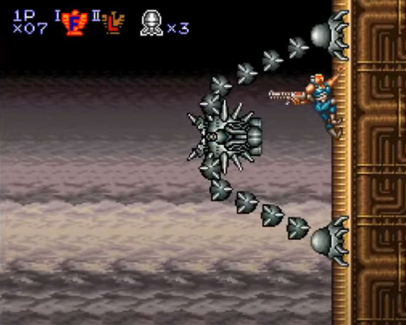 Avec une réputation déjà très correcte, obtenue en arcade et sur NES, la licence Contra débarque donc en 1992 sur la console 16 bits de Nintendo. Un opus qui nous envoie en 2636, sur une planète Terre en proie à une invasion extra-terrestres, qu’il faudra évidemment déloger à grands renforts de mitraillettes, lance-missiles et autres lance-flammes, en solo, comme en duo.