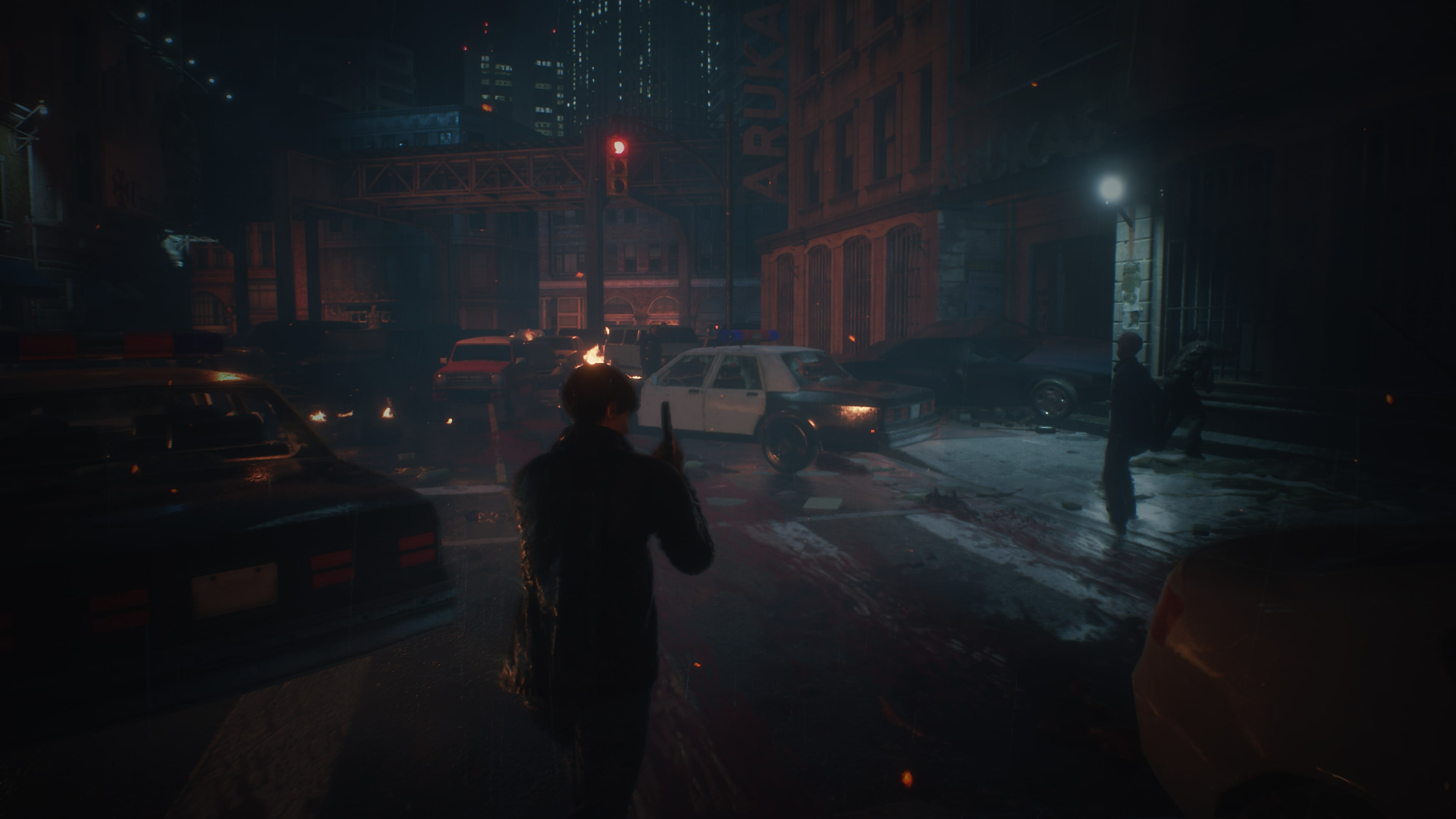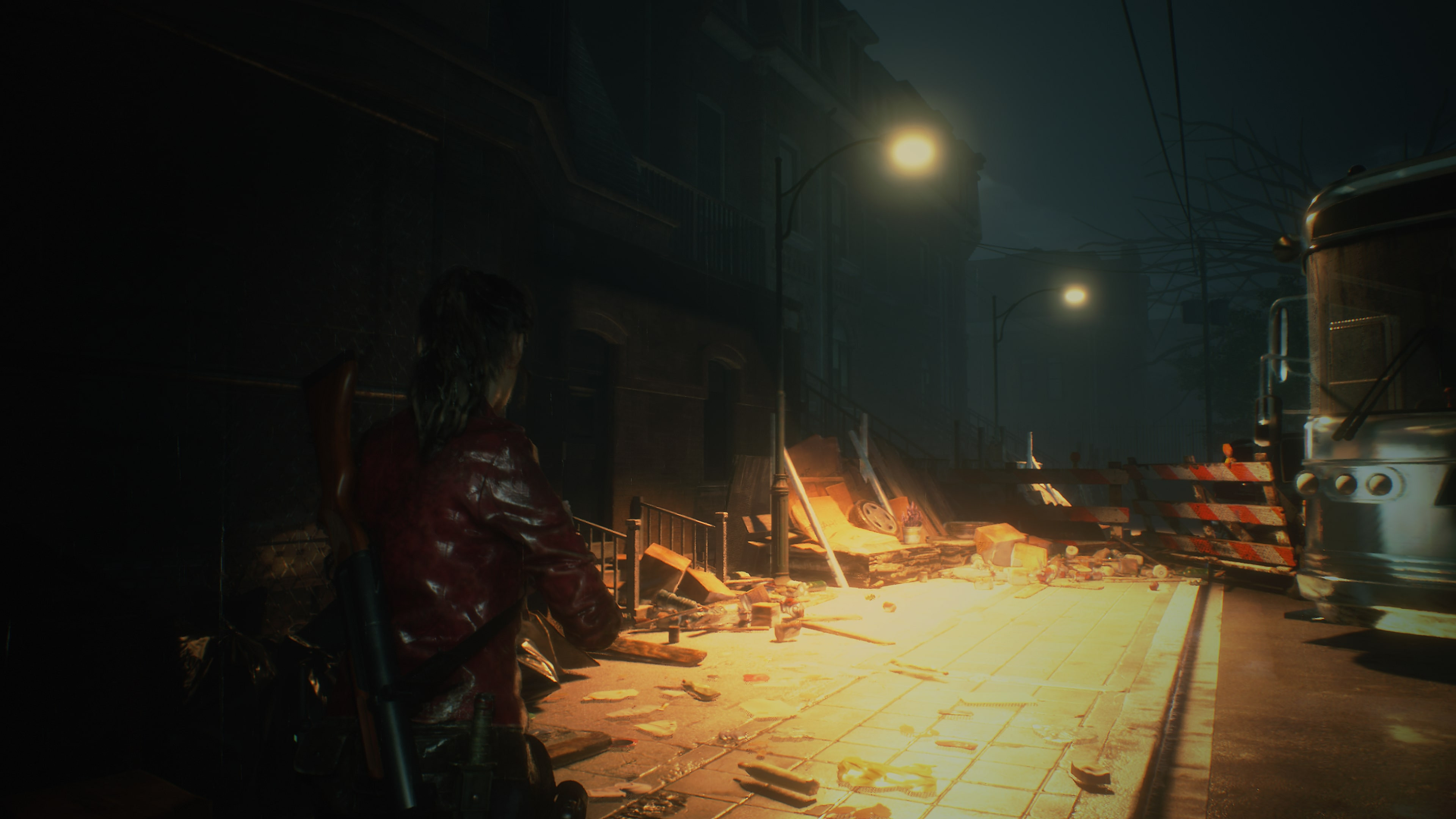 Le RE Engine avait déjà fait montre de sa docilité dans Resident Evil 7, et il ne s'en sort pas moins bien dans un jeu à la troisième personne. Mis à part quelques visages féminins à la limite de l'uncanny valley, le moteur de Capcom délivre un univers graphique impeccable sur tous les aspects.Il y a ces effets de lumière, d'abord, qui créent de parcimonieux halos qui viendraient presque nous rassurer de leur lueur jaunâtre. La réflexion des lampadaires sur un bitume trempé de pluie et maculé de sang est un bien étrange sujet de contemplation, et pourtant...