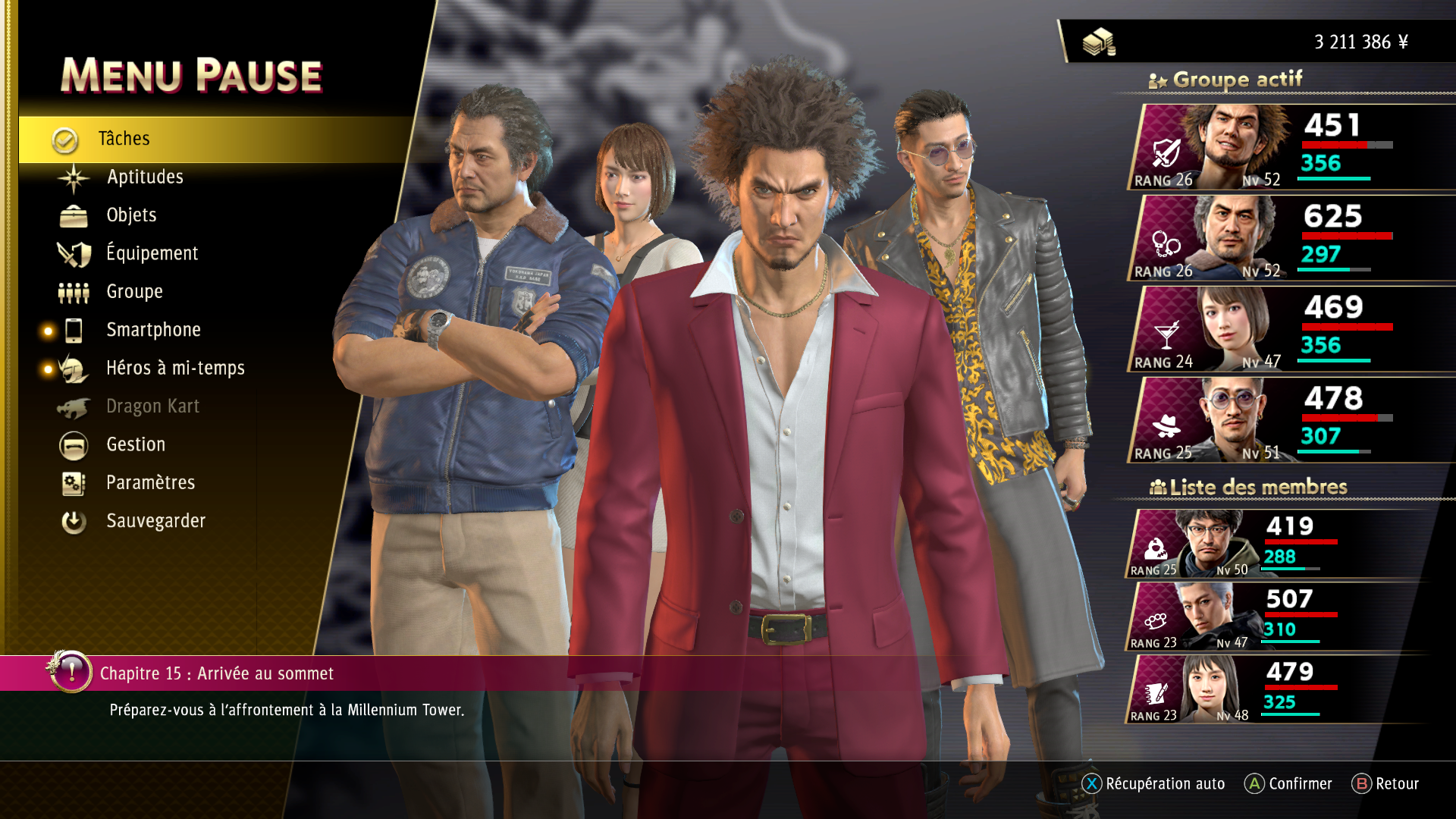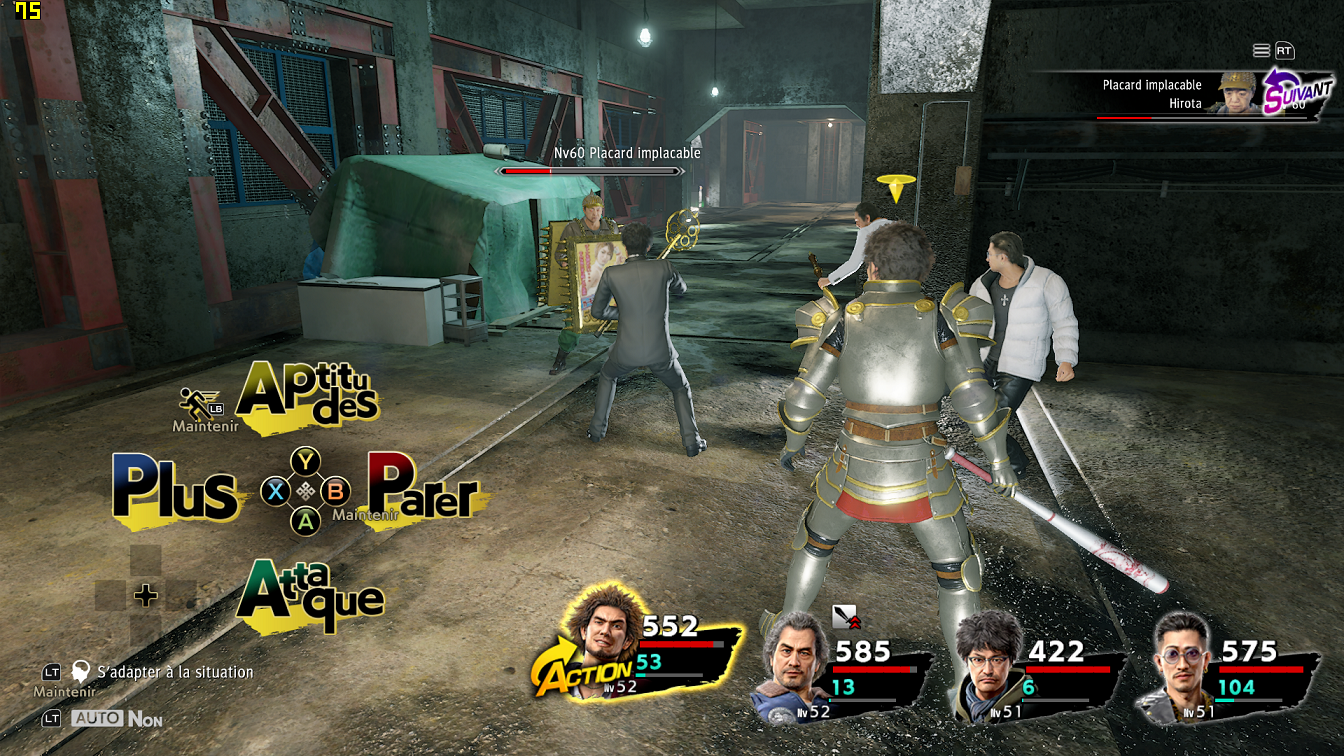 Il s'agit de l'équivalent de la magie dans un RPG classique : chaque personnage dispose d'aptitudes offensives, défensives et de soutien puisant dans une jauge de points dédiée. Ces aptitudes sont à la fois nombreuses et redoutables, à tel point qu'on finit vite par n'utiliser plus qu'elles, ou pas loin. Le choix des personnages (donc de leurs aptitudes) est déterminant dans la préparation de son équipe, mais heureusement, une fois la composition de celle-ci arrêtée, rien n'est figé. Car Yakuza: Like a Dragon a la bonne idée de permettre de troquer un personnage contre un autre en cours de combat au prix d'une action, via l'option « Remplacer » — de sorte qu'on est jamais pris au piège face à un boss dont les caractéristiques mettent notre composition de départ en échec.