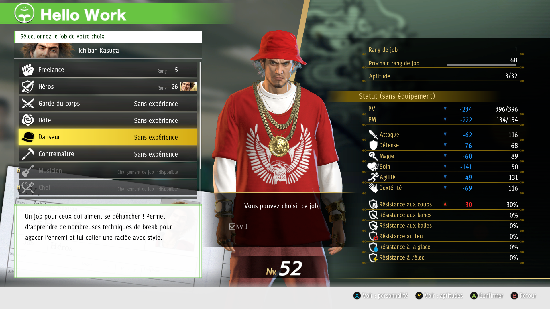 La marge d'évolution de chacun des membres de notre groupe est extrêmement large, tout particulièrement grâce à un système de jobs hérité là encore de grands classiques du J-RPG. En effet, assez tôt dans la progression s'ouvre la possibilité de changer de job en se rendant au Pôle Emploi local. Le niveau acquis dans un job étant décorrélé du niveau du personnage, en changer ne nous ramène donc pas tout en bas de l'échelle mais nécessite néanmoins de charbonner pour regagner tous ses galons et renouveler son équipement puisqu'un garde du corps, par exemple, ne se bat pas avec les mêmes armes qu'un chanteur ou un artiste martial. En contrepartie, notre répertoire d'aptitudes s'en trouvera considérablement étoffé, puisque chaque job en apporte de nouvelles à mesure que l'on monte en grade. Une reconversion professionnelle qu'on en envisagera donc plus volontiers une fois bien avancé dans le jeu histoire de gagner rapidement en niveau.