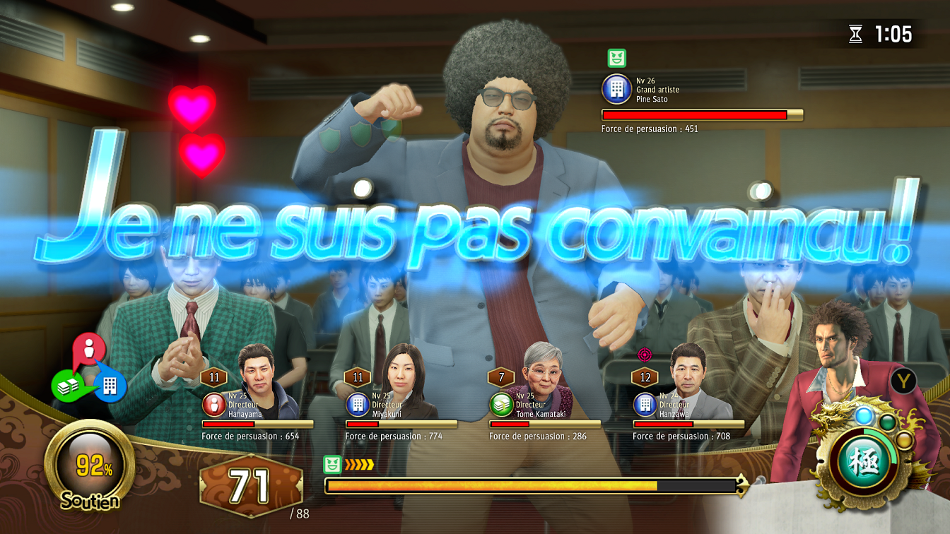 On retrouve également une activité de gestion d'entreprise, cette fois à travers la société Ichiban Confections. Embauches, licenciements, acquisitions, ventes, bien-être des employés ou encore investissements plus ou moins risqués font partie des nombreux paramètres dont il faudra tenir compte avant d'aller affronter le comité des actionnaires en réunion de fin d'exercice. Une confrontation qui prend d'ailleurs la forme d'un mini-jeu plutôt bien fichu, au cours duquel on envoie ses meilleurs employés contre-argumenter face à l'inquisition des actionnaires. Cette activité de gestion constitue ainsi un jeu dans le jeu vraiment passionnant, puisqu'il faudra même partir à la rencontre de nouveaux employés en arpentant les rues et ainsi tenter de dénicher les meilleurs éléments.