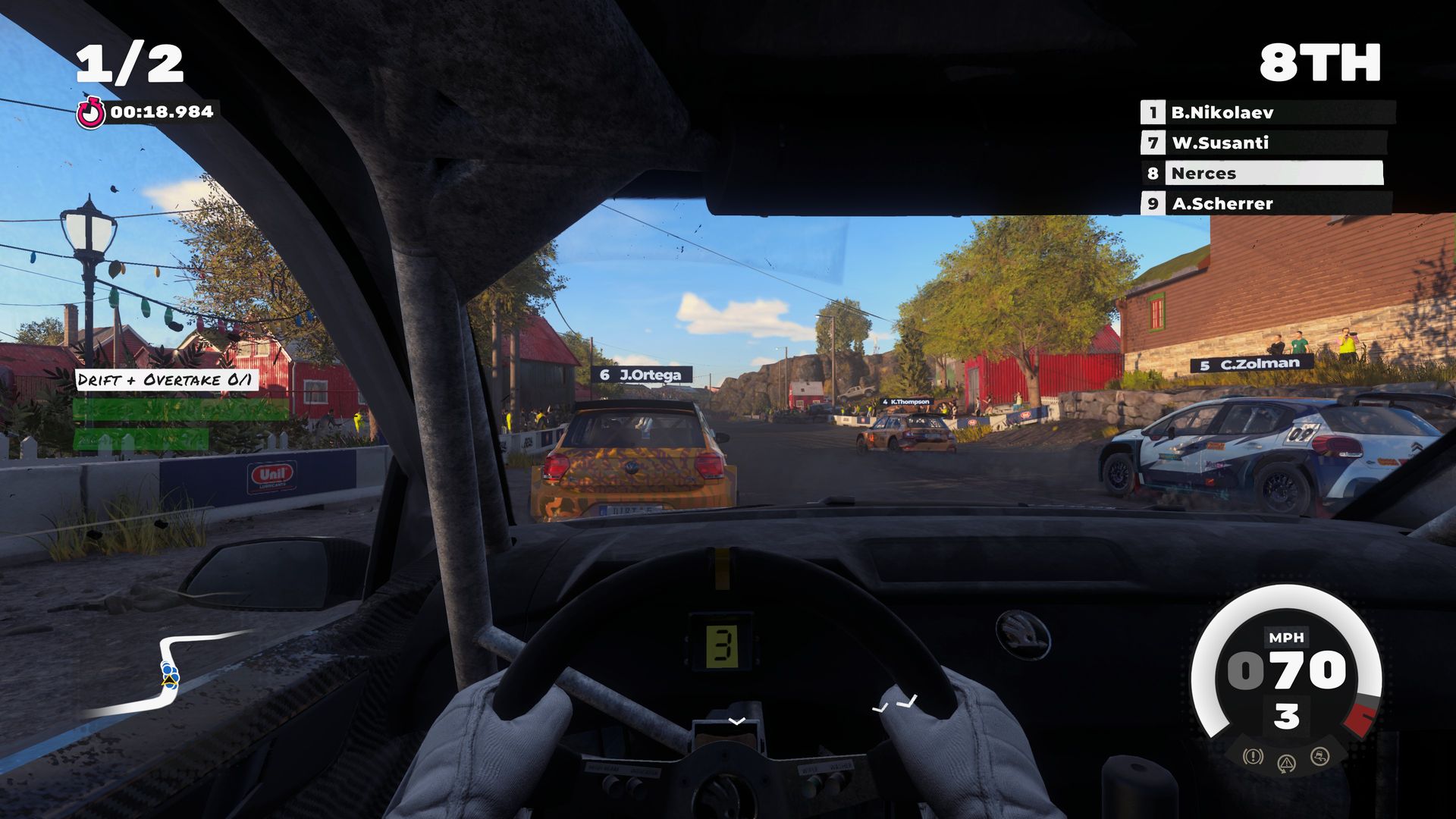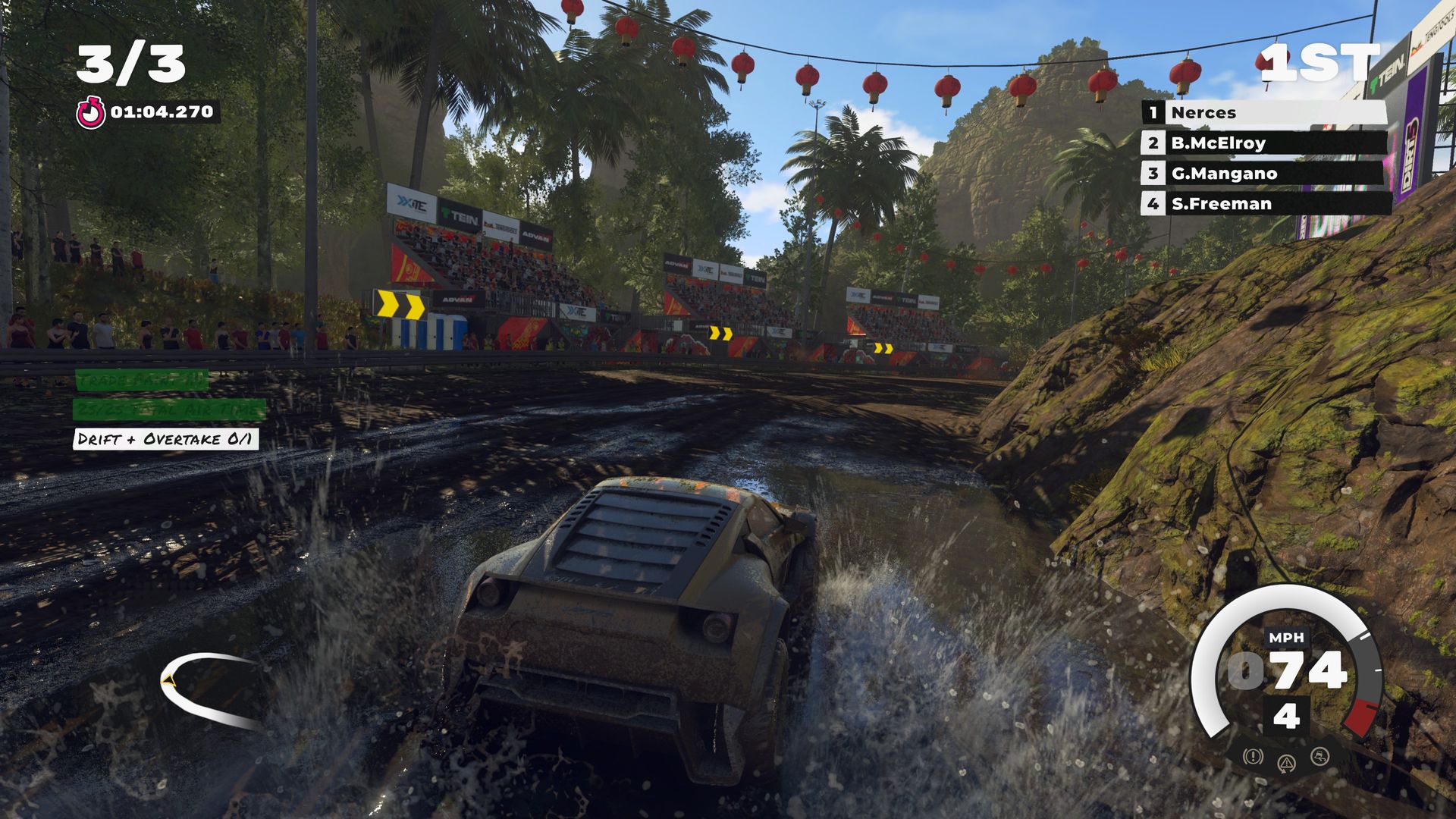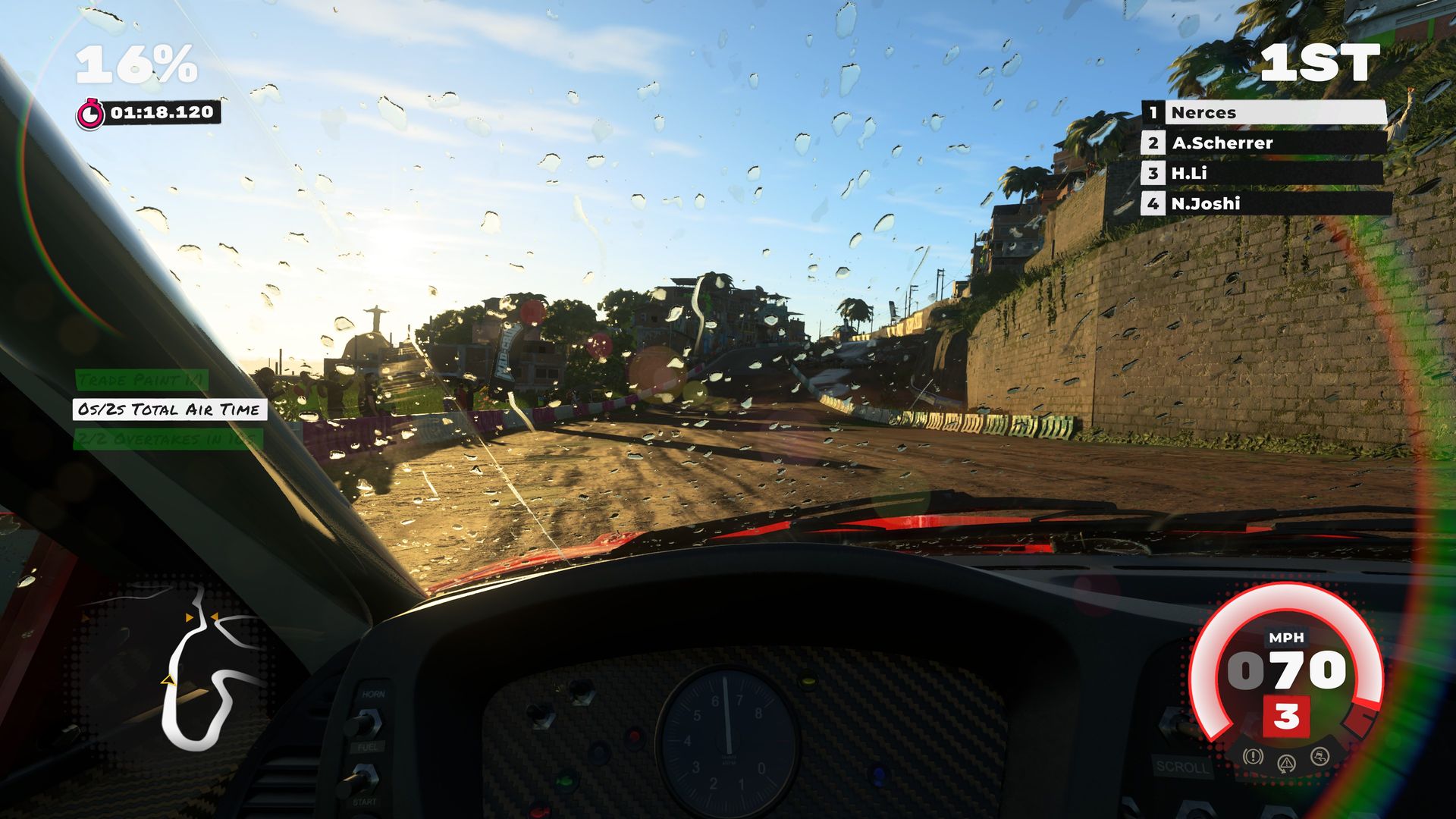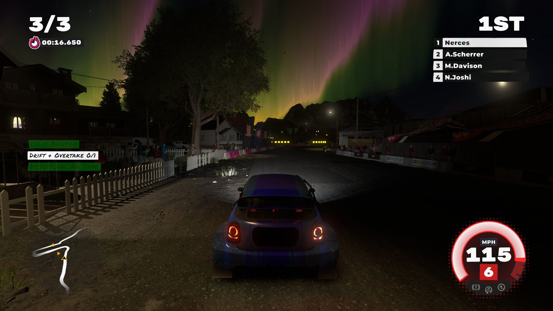 Histoire de ne pas faire très original, la carrière en question est bien sûr celle d’un petit nouveau qui doit tenter de s’affirmer au milieu des meilleurs pilotes de la planète. Sans doute pour limiter le budget, il n’est toutefois pas question de scénariser tout cela. Il n’y a donc aucune cinématique pour illustrer la progression du joueur, aucune rencontre avec les autres pilotes. En réalité, les éléments « extérieurs » se résument à quelques interventions audios de voix bien connues des joueurs, Troy Baker (Death Stranding) et Nolan North (Uncharted).