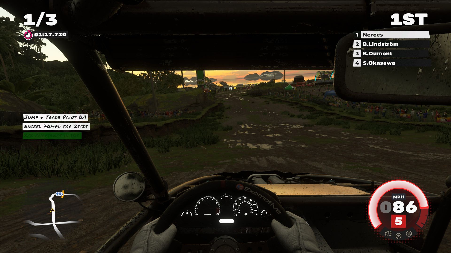 Comme d’autres avant lui, Codemasters affine un peu cette progression en attribuant des « timbres » pour chaque épreuve remportée. Dès lors qu’un certain nombre de timbres est obtenu, le chapitre suivant se débloque de sorte qu’il n’est pas nécessaire de tout réussir pour progresser. Compte tenu de la quantité et de la variété des épreuves proposées, ce n’est clairement pas une mauvaise idée : dans le lot, vous aurez certainement des épreuves qui vous tenteront moins, des événements dans lesquels vous êtes moins à l’aise.