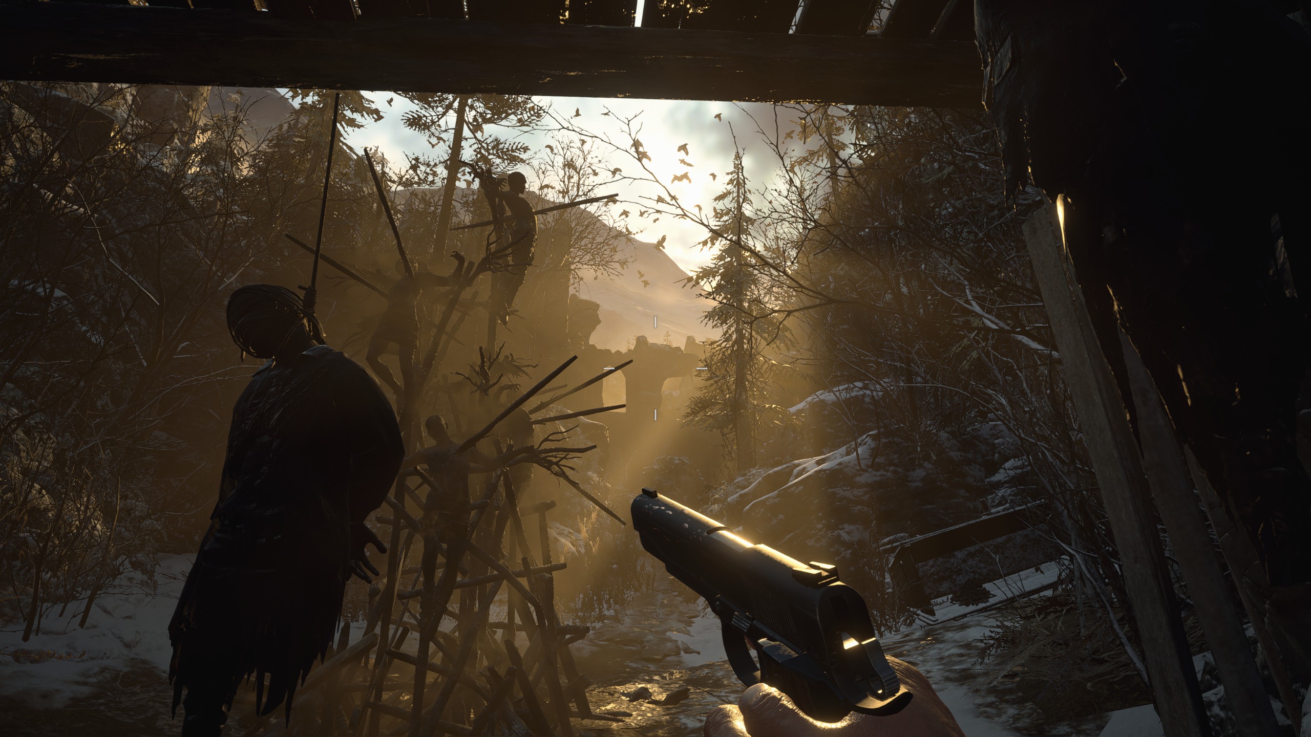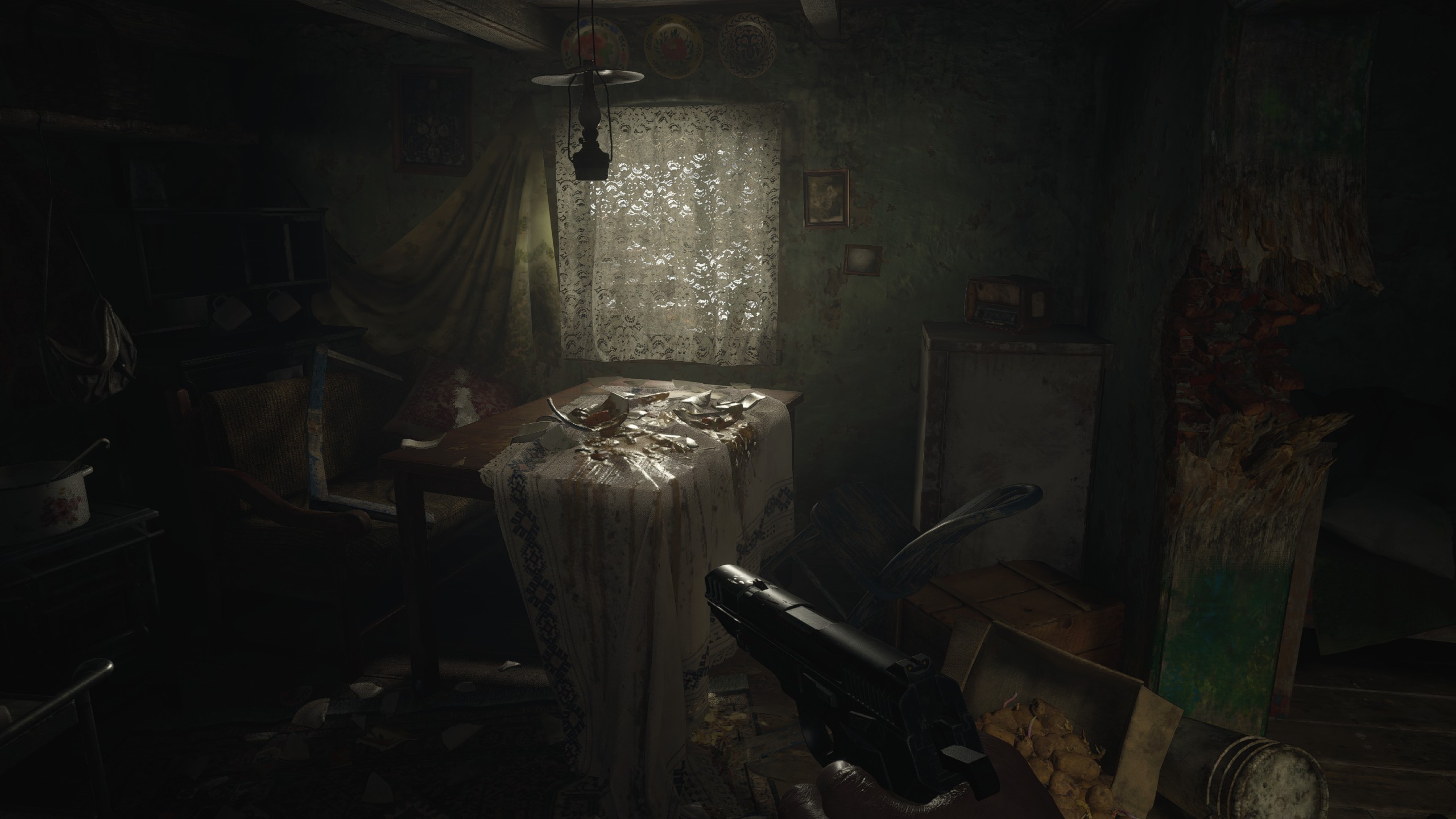 La réalisation est également un facteur déterminant dans notre appréciation du jeu. Les décors fouillés des intérieurs témoignent d’un fascinant naturalisme du désespoir : des nappes froissées, gamelles abandonnées à la hâte sur le feu, tapis gorgés de matière organique visqueuse et autres bougies qui se consument en arrière plan constellent les cahutes déglinguées et crédibilisent grandement ce hameau putride, nourrissant notre fascination morbide pour les screenshots délicieusement glauques. Les extérieurs ne sont pas en reste, Village profitant de la vue FPS pour multiplier les panoramas magnifiques, les happenings visuels horrifiques et les reliefs mystérieux.