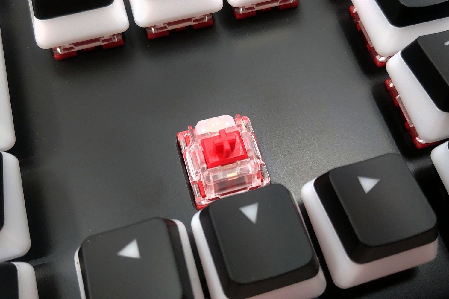 Sous ces touches au design si particulier, HyperX a placé des contacteurs qu’il a lui-même conçus : les HyperX Red, des switchs mécaniques dits « linéaires » de couleur, vous l’aurez deviné, rouge. Sans surprise, ils présentent des caractéristiques proches des fameux MX RED signés Cherry et nécessitent notamment une force d’activation de 45 cN. Ils disposent en revanche d’une course totale plus courte (3,8 mm contre 4 mm chez Cherry) et s’activent aussi plus tôt (1,8 mm contre 2 mm chez Cherry). Des différences subtiles sur le papier, mais qui ne manqueront pas de faire réagir les experts toujours à la recherche de l’excellence.
