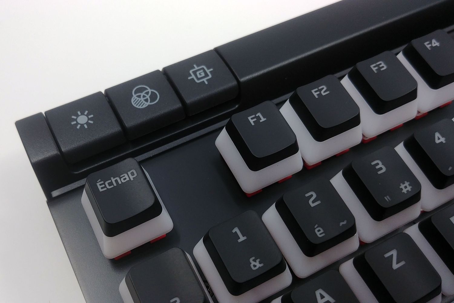 Cette étape passée, le confort de frappe est bien là, même s’il aurait été agréable de disposer d’une inclinaison plus prononcée et d’un repose-poignets. En jeu, les contacteurs font merveille même si des puristes leur préféreront des clicky. C’est réactif, précis et les touches ne glissent pas le moins du monde. Bien sûr, nous profitons aussi de l’anti-ghosting intégral, du N-key roll over et d’une petite fonction bien pratique activable avec une des touches du coin supérieur gauche : le mode gaming qui vient désactiver les touches de raccourcis Windows afin d’éviter toute maladresse. Une fonction qui peut aussi s’activer via l’interface logicielle.