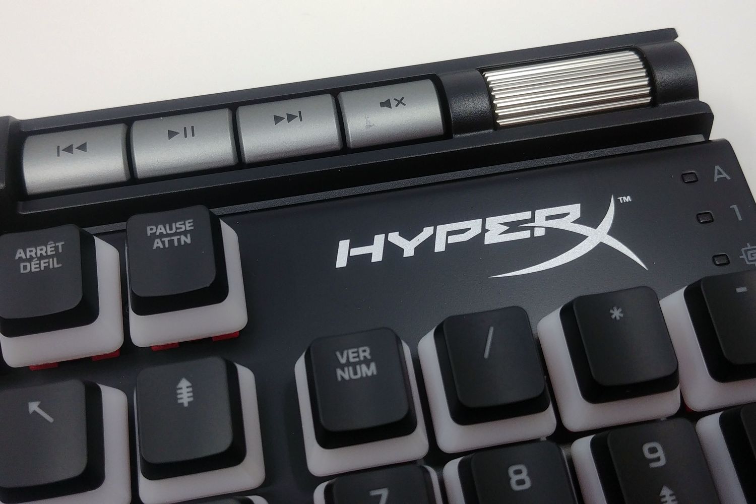 Vous pouvez peut-être le deviner sur nos photos, mais HyperX a opté pour un châssis intégralement en métal particulièrement robuste qui explique aussi pourquoi la bête accuse plus de 1500 grammes sur la balance. Aucune crainte de l’abîmer ou de simplement le tordre en exerçant trop de pression sur lui : le châssis paraît prêt à tout endurer. Nous l’avons dit, il s’agit d’un modèle pleine largeur ce qui signifie que l’on peut compter sur la présence du pavé numérique et du bloc de touches fléchées pour un total de 105 touches dans notre configuration AZERTY. Notez toutefois la présence de deux ensembles de touches « additionnelles ».