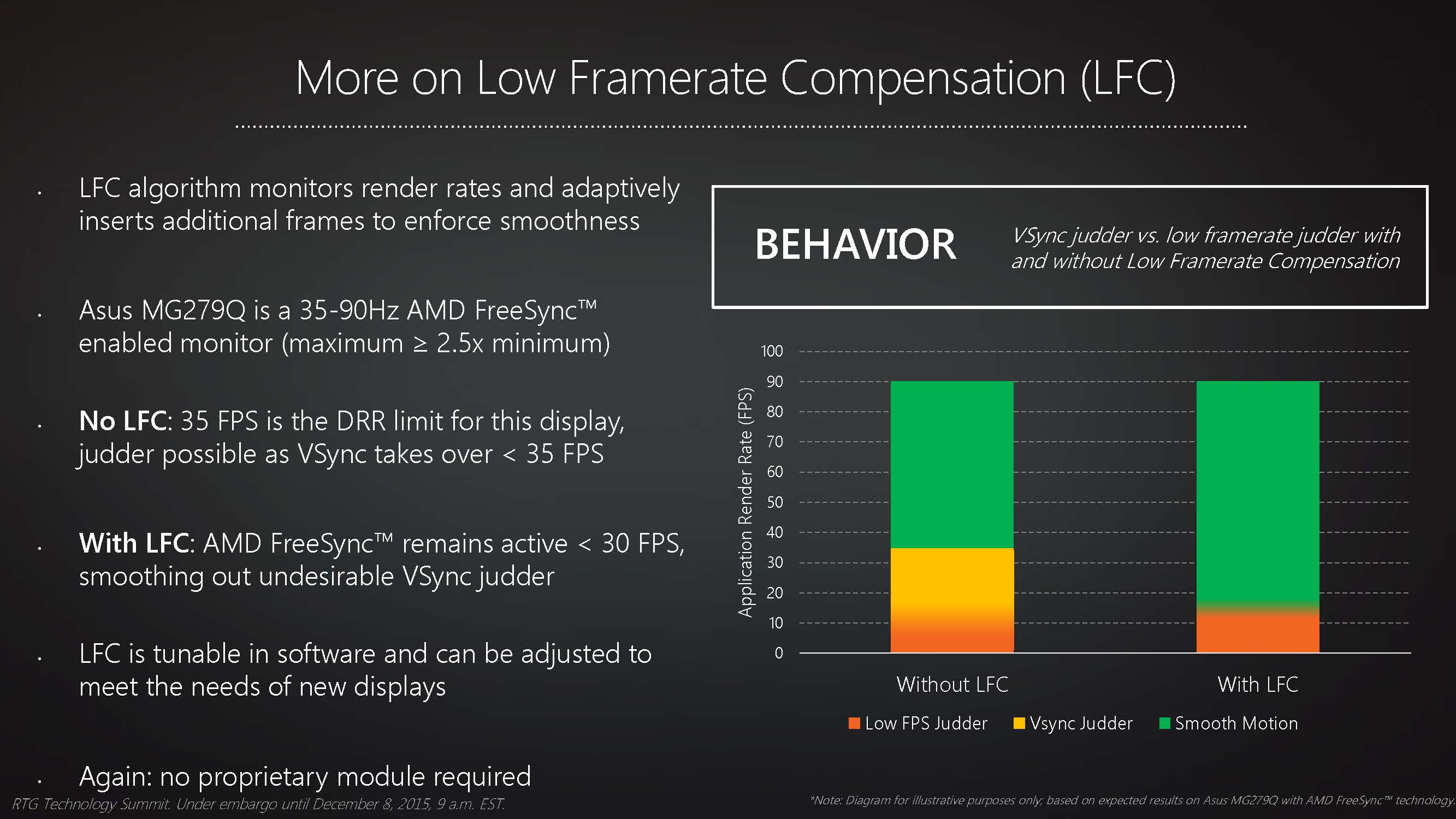 Dans les faits, le module G-Sync effectue des tâches supplémentaires en vue de réduire le ghosting (flou de mouvement) et optimise l'affichage lors de chutes de FPS. Jusqu'à l'arrivée des pilotes supportant le LFC (Low Framerate Compensation), le FreeSync gérait relativement mal les chutes de FPS en dessous de la limite basse de la plage de fréquences de l'écran, alors que le module de NVIDIA permet une synchronisation sur des intervalles plus larges. Il aura fallu plus de deux ans à AMD pour s'attaquer à ce problème épineux et faire en sorte que l'écran ne retombe pas à une fréquence fixe obligeant les joueurs à retomber dans les travers de la V-Sync.