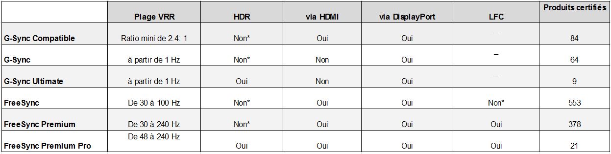 Cette surprise que l'on attendait plus de la part de NVIDIA a entrainé quelques changements d'un côté comme de l'autre. Forts des centaines de moniteurs et des dizaines de TV prenant en charge FreeSync, les rouges ont clarifié les choses en présentant trois catégories FreeSync dont le FreeSync Premium, une nouveauté dévoilée lors du CES 2020.Pour résumé, chez AMD on retrouve donc des moniteurs :