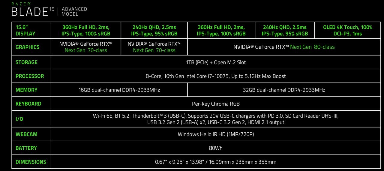Souvenez-vous, l'an dernier il n'était question que de 300 Hz… même si on se demande bien l'intérêt de progresser encore à ce niveau. On remarque aussi que Razer ne proposait l'an dernier « que » trois variantes de son advanced model : il est aujourd'hui question de cinq produits sur lesquels la dalle change afin d'alterner entre Full HD @ 360 Hz ou QHD @ 240 Hz. La solution graphique NVIDIA varie également avec deux modèles : un GPU GeForce RTX 3070 Laptop ou un GPU GeForce RTX 3080 Laptop sachant que ce dernier existe en version 8 Go ou 16 Go de VRAM.