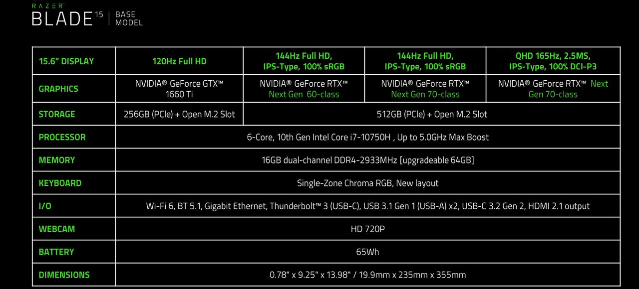 Ces dalles IPS sont capables d'une fréquence de rafraichissement d'au moins 144 Hz - sauf pour ce petit dernier donc (120 Hz) et sauf pour le plus ambitieux, qui grimpe lui jusqu'à 165 Hz. Pour animer cette dalle, Razer ne fait pas évoluer la carte graphique du modèle le moins coûteux : NVIDIA n'a encore rien proposé pour remplacer la GeForce GTX 1660 Ti. En revanche, les autres modèles passent, selon le cas, à la GeForce RTX 3060 Laptop (6 Go de VRAM) ou la GeForce RTX 3070 Laptop (8 Go de VRAM).