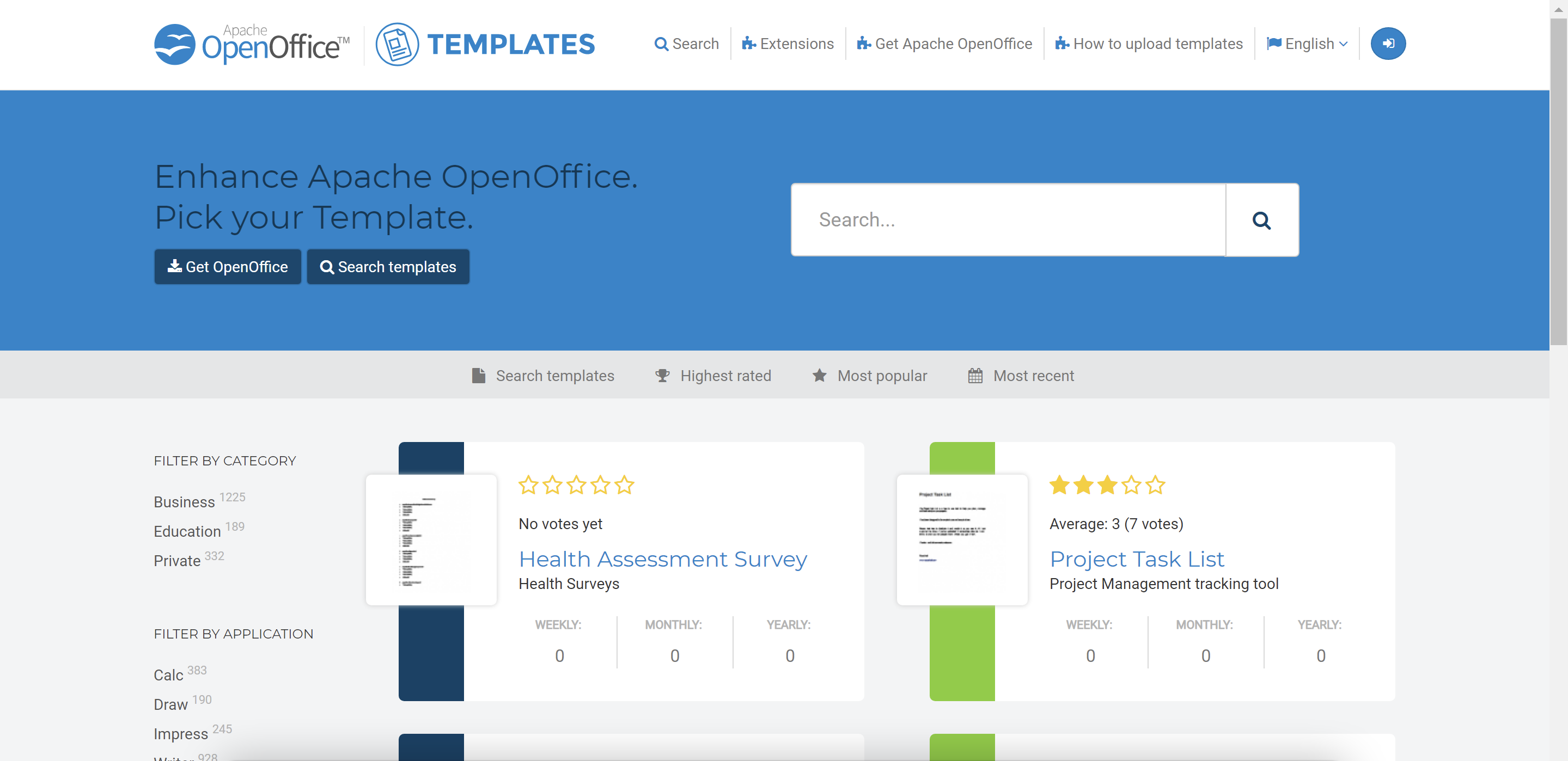On retrouvera également un bon nombre de Templates (ou modèles en français). Par exemple, on pourra télécharger des packs de templates destinés à être utilisés dans le traitement de texte, le tableur ou bien l'outil dessin.