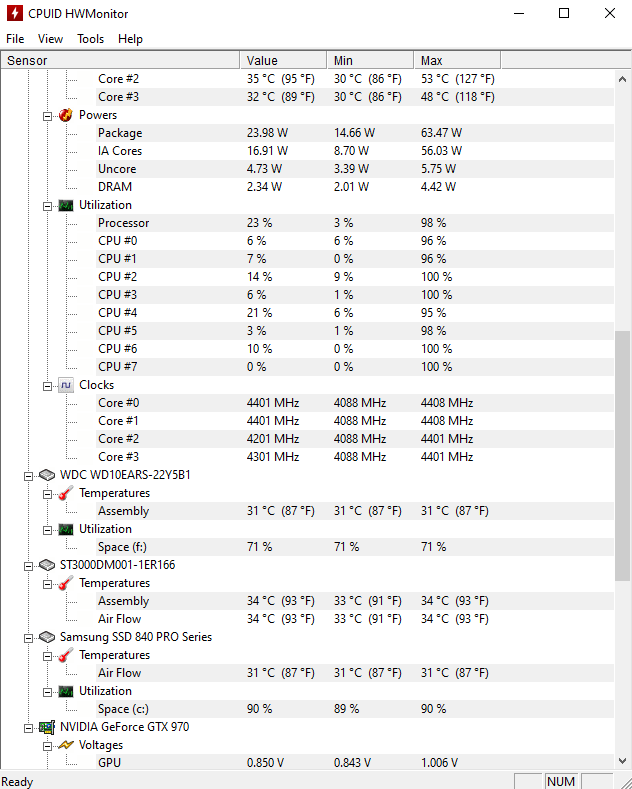 Minimaliste et très simple d'utilisation, HWMonitor propose une seule et unique fenêtre en guise d'interface. Cette dernière regroupe toutes les informations nécessaires comme les températures des différentes sondes et capteurs, le voltage du processeur ainsi que l'utilisation, la fréquence, la température et la puissance de chaque cœur.