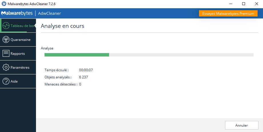 La plupart des outils indésirables dont nous avons parlé s'immiscent lors de l'installation de logiciels tiers. Ils peuvent se manifester sous la forme de programmes publicitaires, de détournements de la page de démarrage du navigateur ou par de faux outils de nettoyage. AdwCleaner permet d'analyser et détecter ces menaces au sein du système en quelques étapes :