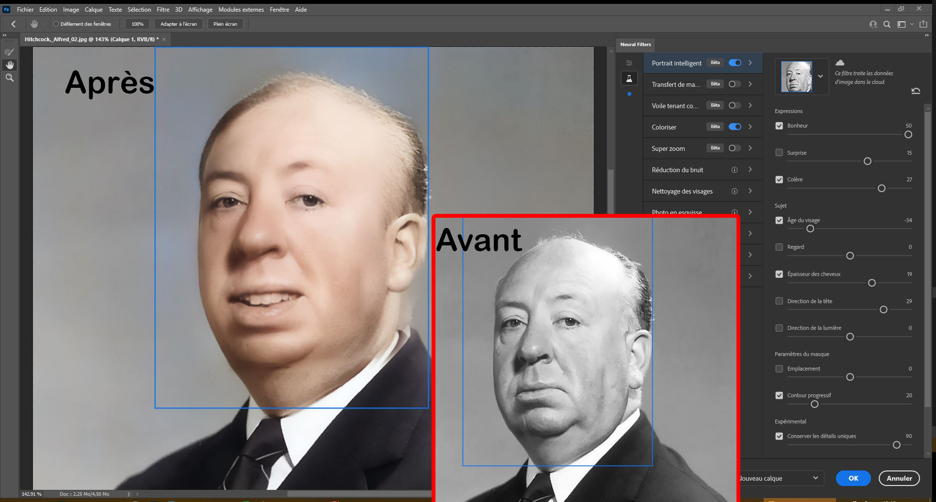Sensei, l'intelligence artificielle d'Adobe est de plus en plus présente dans Photoshop. Le logiciel phare d'Adobe permet de déplacer un objet dans une scène en remplissant automatiquement le fond. Dans cette dernière mouture, l'utilisateur peut aussi remplacer le ciel sans avoir à réaliser de fastidieuses étapes préparatoires. L'IA double également la résolution des images en extrapolant les pixels dans le mode « super résolution ». Mais, la puissance de Sensei est encore plus spectaculaire avec les filtres neuronaux. Ici, l'intelligence artificielle analyse et transforme les visages. Elle modifie la direction du regard ou lisse les imperfections d'un visage. Un portrait triste peut devenir souriant et inversement. L'IA colorise également une photo noir&blanc. Ces fonctions étonnantes sont encore en phase bêta et nécessitent une connexion internet.