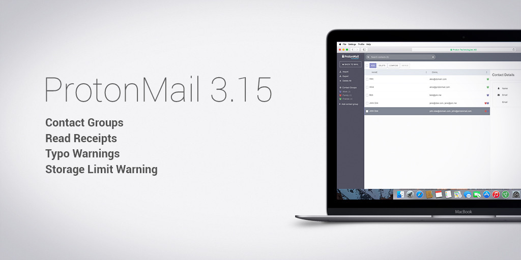 ProtonMail, le service mail open source chiffré de bout en bout, vient de passer à la version 3.15. Au programme des nouveautés : groupes de contacts, accusés de réception et autres améliorations.